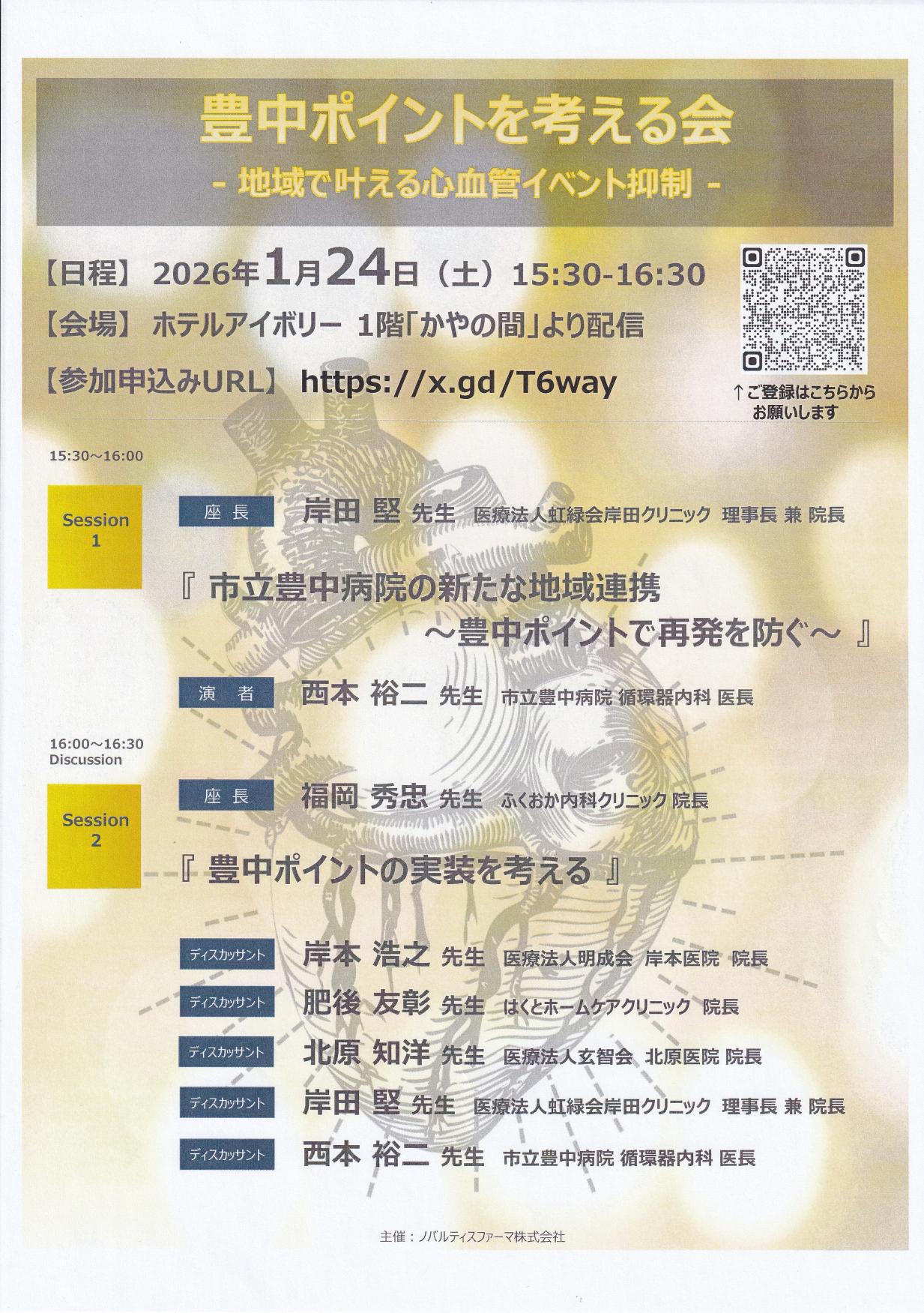 2026年1月24日豊中ポイントを考える会に参加してきました。 市立豊中病院の循環器内科の先生と我々開業医が連携を取りながら、患者さんの心血管イベント(心筋梗塞など)を抑制しようという会です。 豊中病院に紹介すべきリスクが高い患者さんの指標をつくるためディスカッションを行いました。 LDLコレステロールが高い人、血圧が高い人、糖尿病がある人、喫煙されている人などをそれぞれの値で数値化し合計点が基準を上回れば紹介するといった内容です。 会の中心メンバーである西本先生は研修医時代に、当時外科専攻医であった私について外科の研修をおこなっておりました。 大変立派になられて今では私が頼りにさせていただき、よく連携させていただいております。 いつもありがとうございます。(写真は豊中病院循環器内科医長 西本裕二先生と)